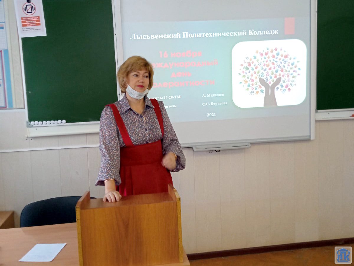 В группе 56-17-ТМ в Международный день толерантности Л.Н.Ширинкина провела конкурсный классный час. Лариса Николаевна пишет: «Мне и ребятам очень понравилась тема. Обсуждали, беседовали, высказывали каждый свою точку зрения, вспомнили поучительные случаи из жизни».