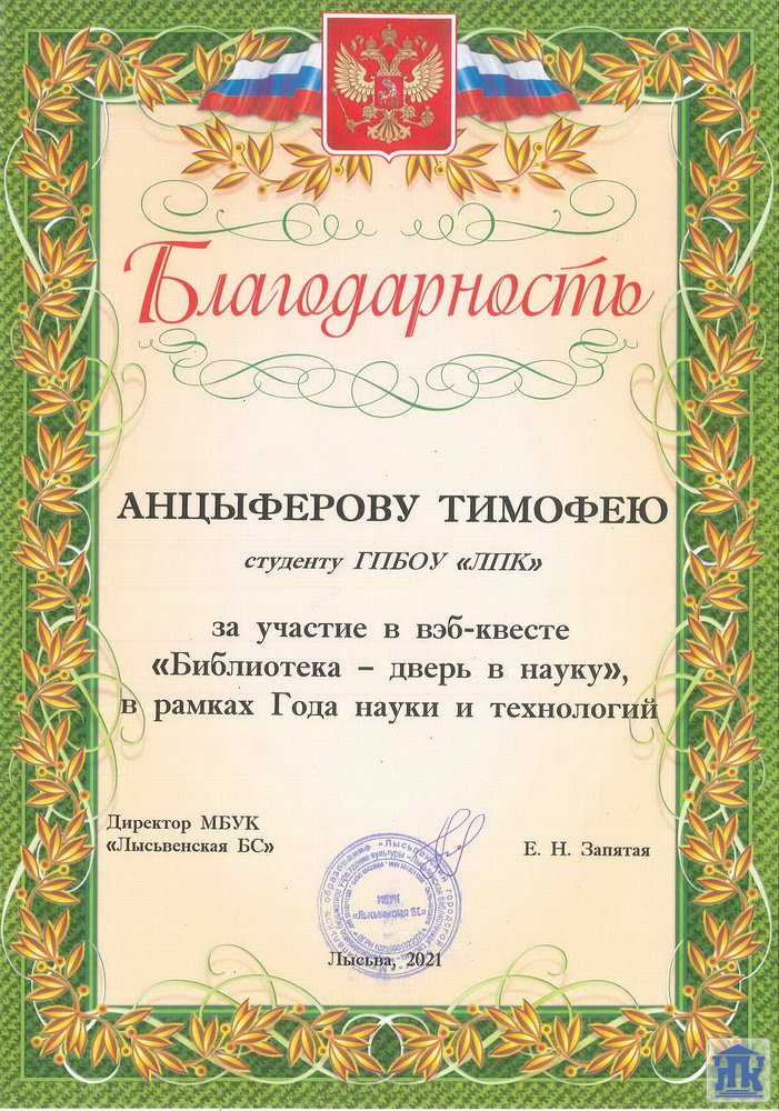 Хочется поблагодарить студентов группы 16-21-ТМ Анцыферова Тимофея, Елохова Кирилла и Мокрушина Максима за активное участие в городском вэб-квесте «Библиотека – дверь в науку». Молодцы!