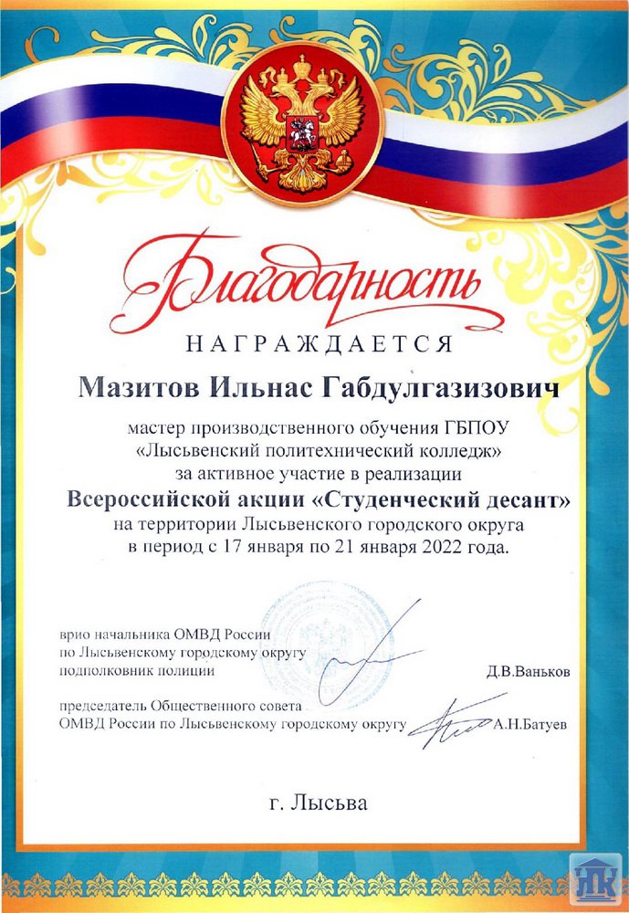 Поздравляем студентов группы 203-20-МАВ Зинину Софью и Колыванова Ивана с отличными результатами в рамках мероприятий, посвященных Всероссийской акции «Студенческий десант» (руководитель: И.Г.Мазитов).