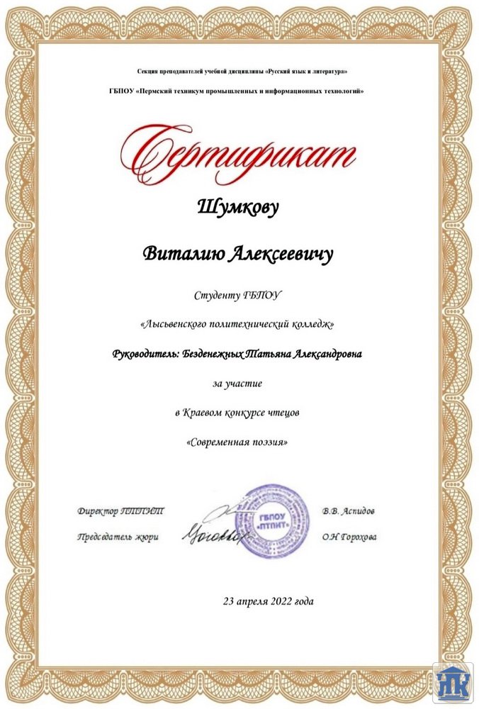 Поздравляем студента группы 207-20-ТУ Шумкова Виталия с успешным выступлением на краевом конкурсе чтецов «Современная поэзия».