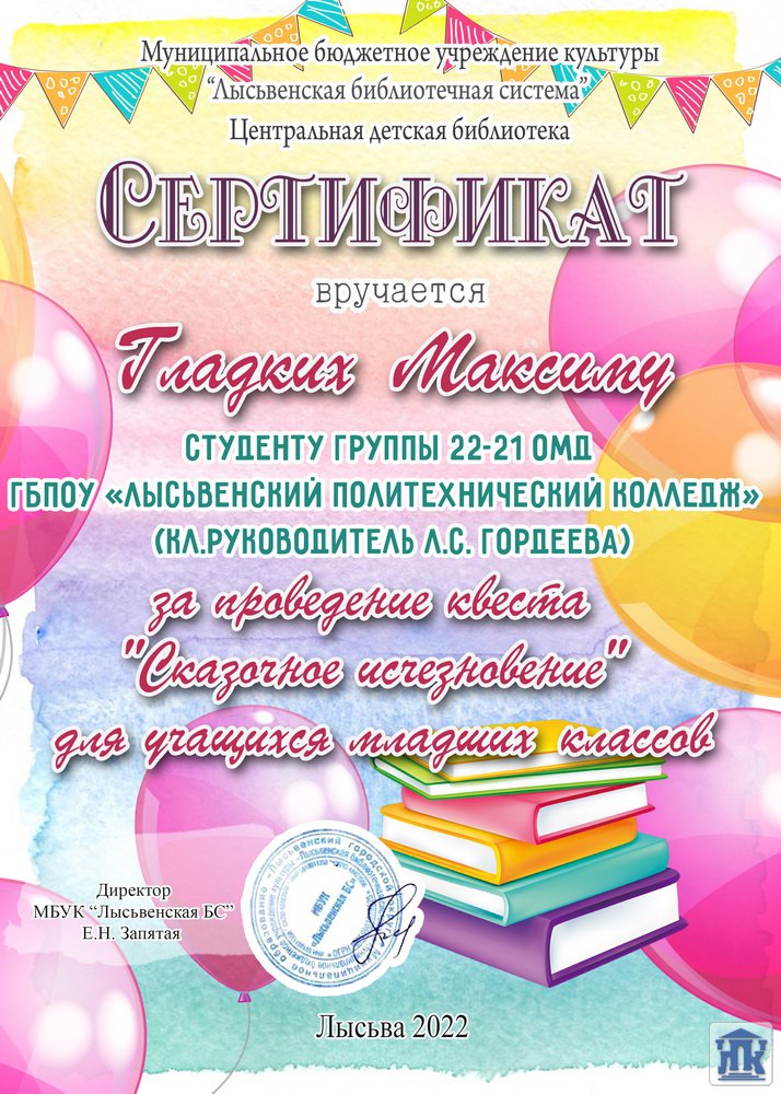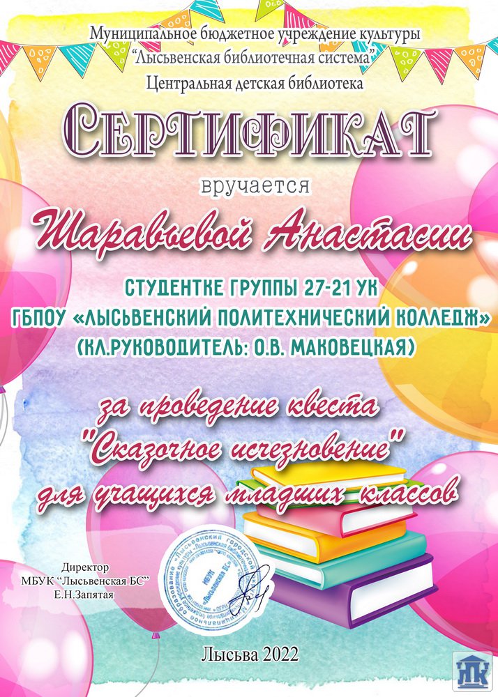 К юбилею писателя Д.Н.Мамина-Сибиряка в Центральной детской библиотеке была открыта выставка книг и организован квест для школьников младших классов «Сказочное исчезновение», который провели студенты колледжа Тестоедова Софья, Шаравьёва Анастасия из группы 27-21-УК, Абраров Руслан и Гладких Максим из группы 22-21-ОМД.