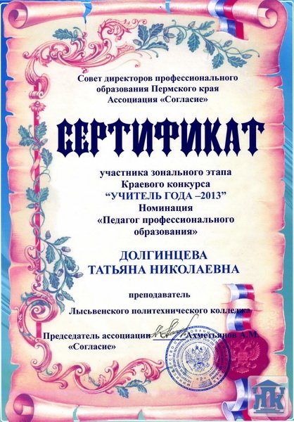 С 12 по 14 февраля в городе Губахе на базе ГБОУ СПО «Уральский химико-технологический колледж» проходил зональный этап краевого конкурса «Учитель года – 2013». Участником этого престижного конкурса от нашего учебного заведения была преподаватель спецдисциплин Долгинцева Татьяна Николаевна.