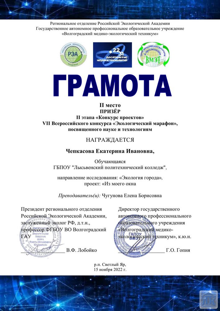 2 этап – «Проект»: Чепкасова Екатерина Ивановна – 2 место; Чугунов Данил Юрьевич – 2 место.