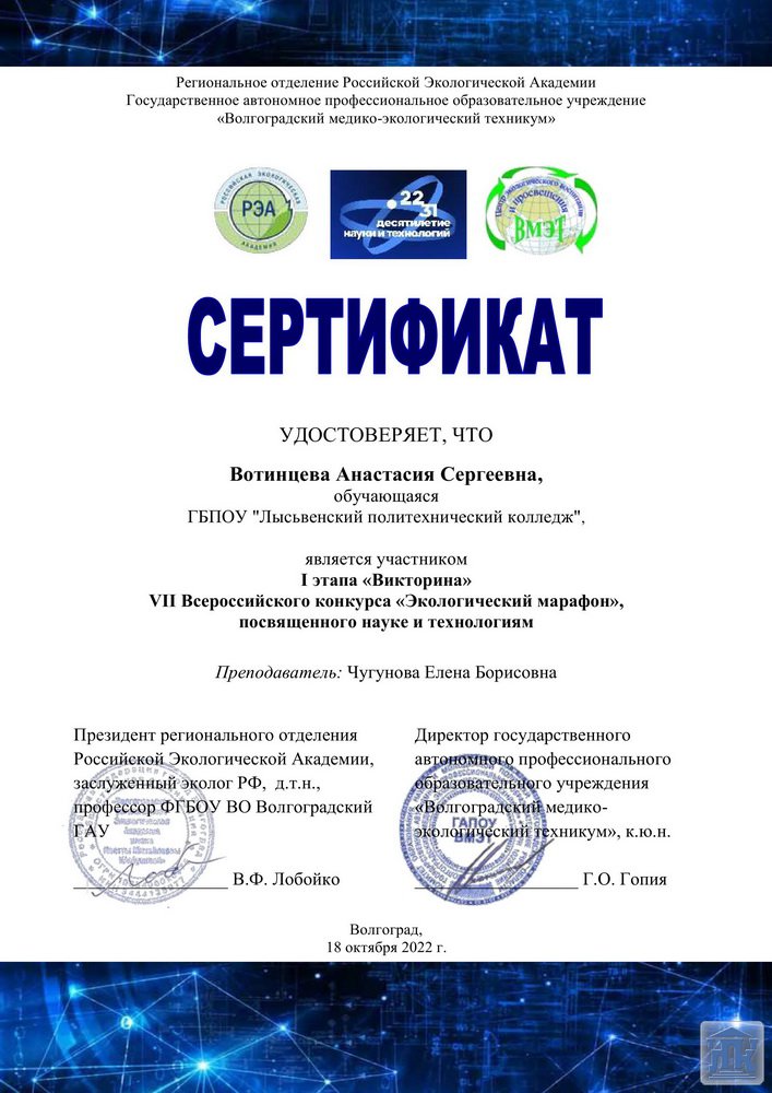 В ГАПОУ «Волгоградский медико-экологический техникум» прошёл заключительный этап VII Всероссийского конкурса «Экологический марафон» среди обучающихся профессиональных образовательных учреждений Российской Федерации, посвященный науке и технологиям.