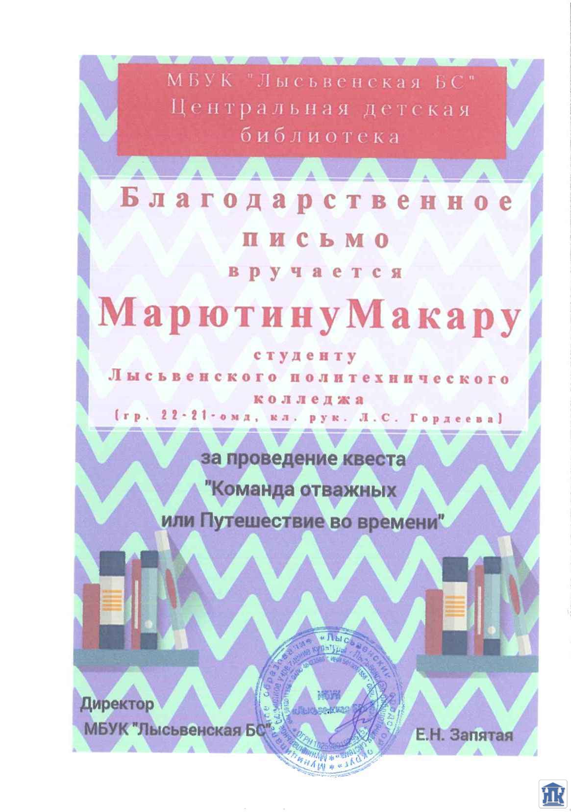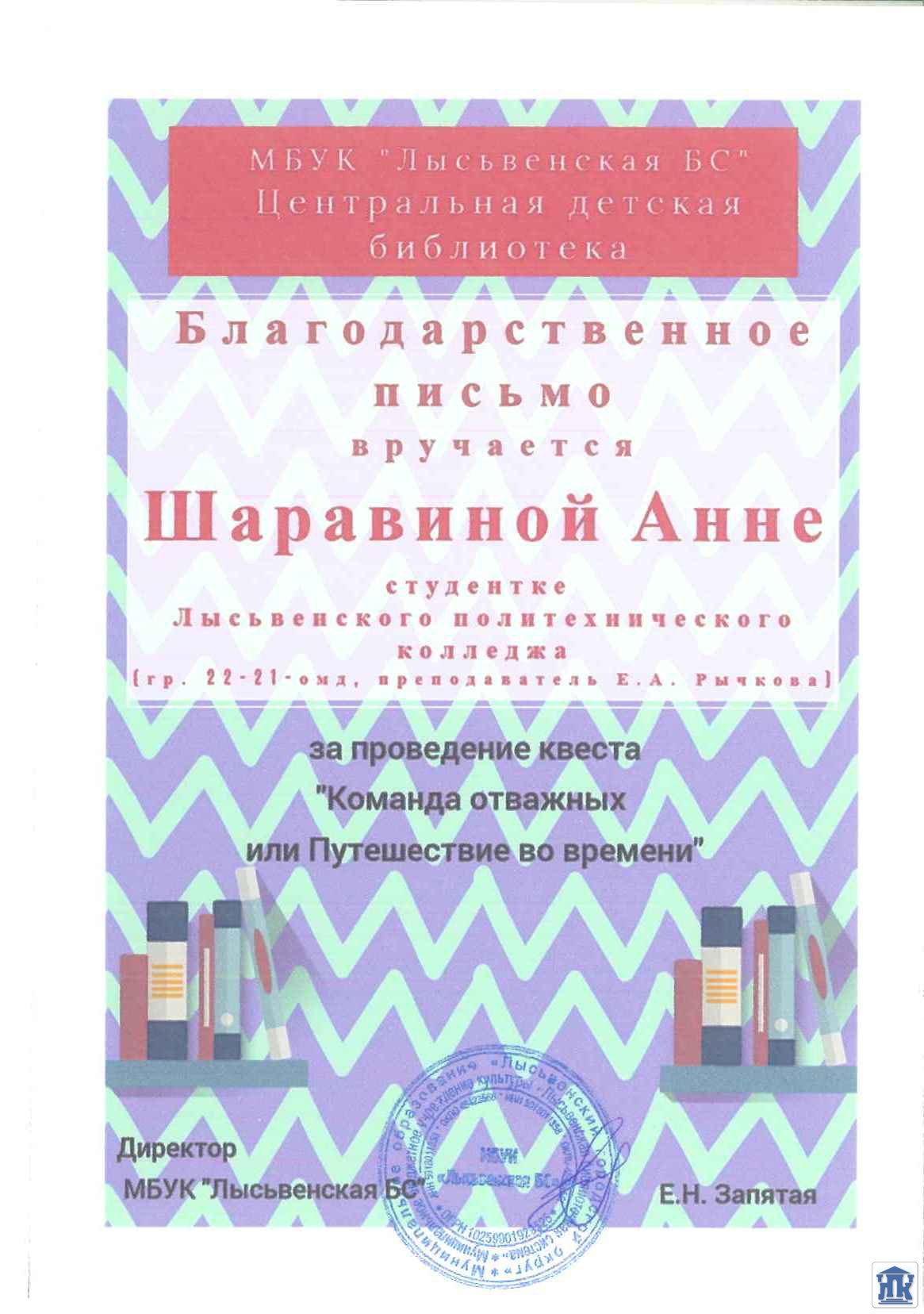 19 апреля студенты-волонтёры из группы 22-21-ОМД снова посетили детскую библиотеку. Они провели квест «Путешествие во времени» для учащихся 4 класса школы №16. Юные читатели, разыскивая исчезнувшую книгу об истории библиотеки, попадают в 1948 год, именно в это время,75 лет назад, в нашем городе и была открыта детская библиотека. Дружный класс там встречает героев книги А.Рыбакова «Кортик», роли которых сыграли наши студенты. Они помогли ребятам решить все трудные головоломки, собрать по крупицам историю библиотеки и найти книгу. После необычного путешествия школьники поделились своими впечатлениями. Одним ребятам, больше всего, понравилось расшифровывать код замка, другим – отгадывать загадки и шарады, третьи сказали, что с удовольствием разучили и спели новую песню. В завершении все участники квеста поздравили детскую библиотеку с юбилеем. Гордеева Лариса Сергеевна преподаватель