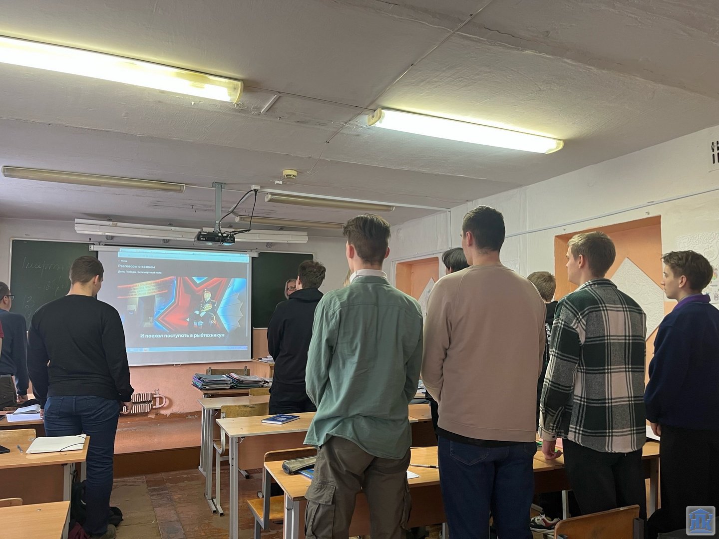 Вчера в колледже прошло внеурочное занятие "Разговоры о важном". Ребята посмотрели и обсудили информацию о "Бессмертном полке", почтили память героев и посмотрели отрывки из фильма "Офицеры"