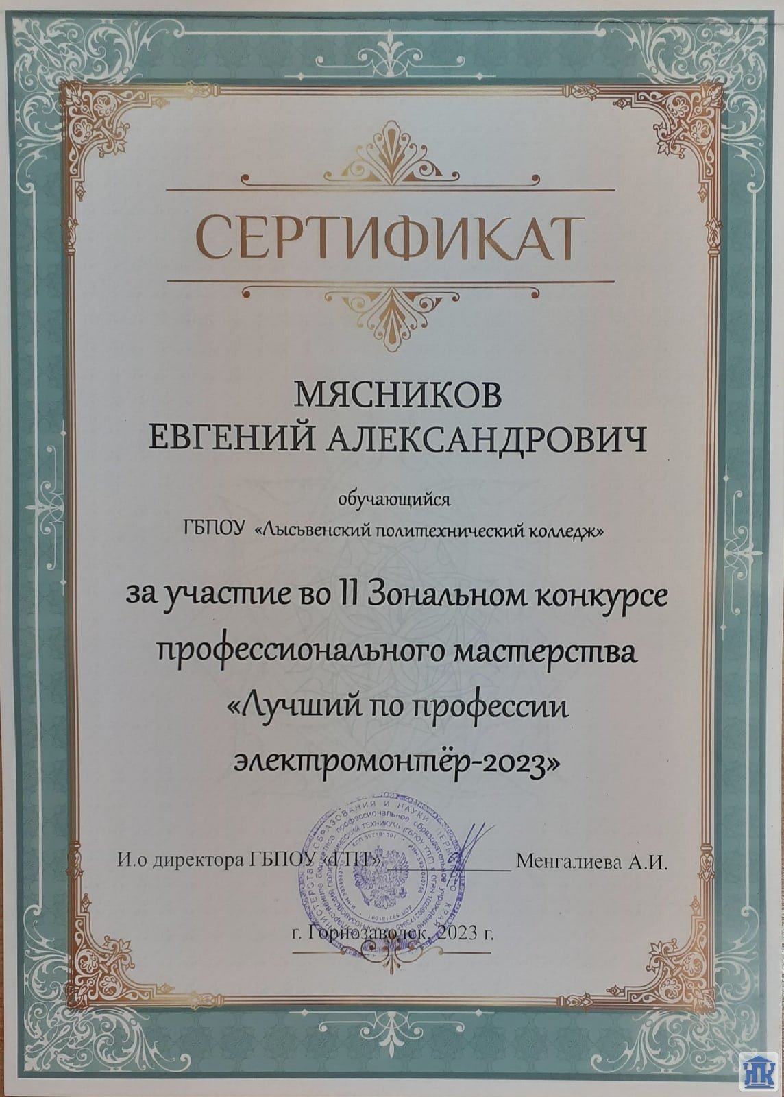 19 мая в г. Горнозаводск прошёл II Зональный конкурс профессионального мастерства «Лучший по профессии электромонтёр-2023».Лысьвенский колледж представляли студенты 2 курса специальности 13.02.11 Техническая эксплуатация и обслуживание электрического и электромеханического оборудования (по отраслям) Мясников Евгений и Низаметдинов Артём. При подготовке к соревнованию нашим конкурсантам пришлось самостоятельно изучить часть учебного материала. И на этапе проверки теоретических знаний выполнить тесты по предметам электротехнического профиля за 2 и 3 курс специальности. Два часа было предусмотрено организаторами конкурса на сборку электрической схемы. Здесь участникам пригодились умения, приобретенные в ходе учебной практики под руководством Мясникова Евгения Сергеевича.