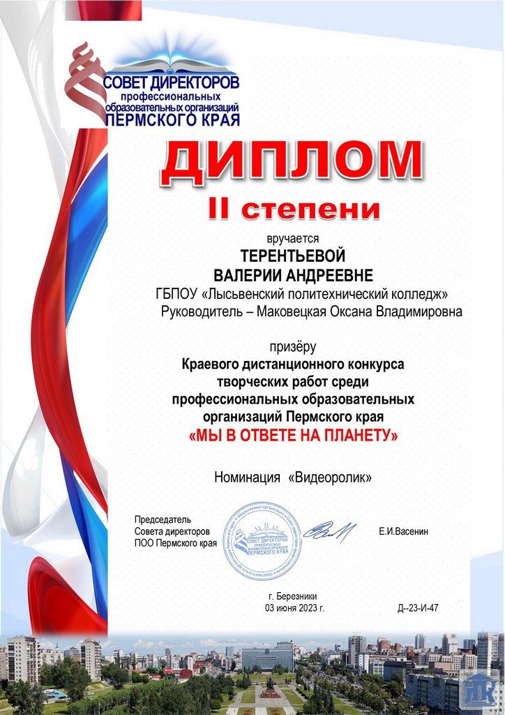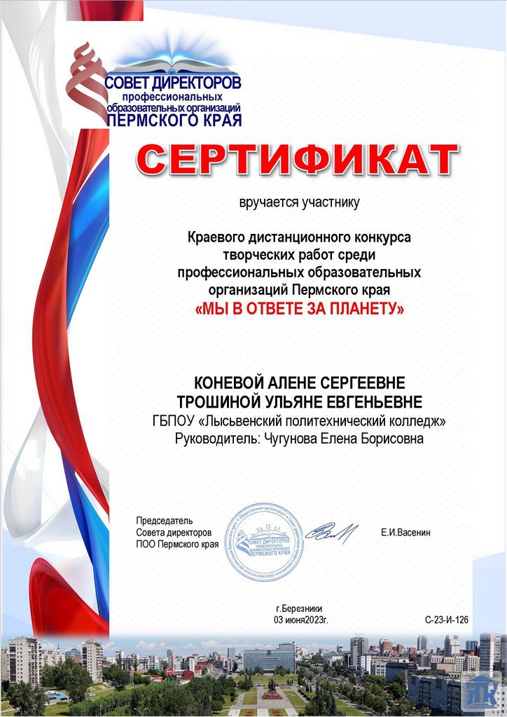 Подведены итоги Краевого конкурса творческих работ «Мы в ответе за планету» среди обучающихся профессиональных образовательных организаций Пермского края. В Колледже был проведен первый этап конкурса, по результатам которого были выбраны лучшие работы, которые были направлены для участия к краевом конкурсе. Поздравляем студентов и преподавателей колледжа с участием в конкурсе.Желаем не останавливаться на достигнутом!