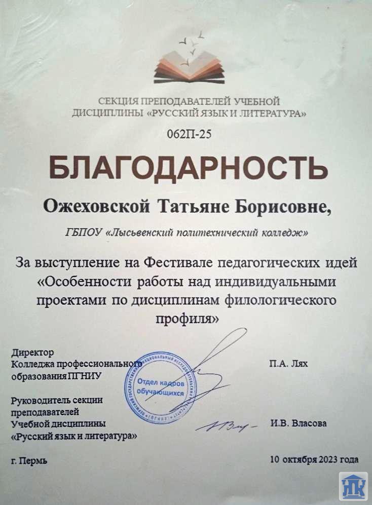 Преподаватели Безденежных Т.А., Ожеховская Т.Б. также представили свой опыт работы с индивидуальными проектами. Безденежных Татьяна Александровна представила опыт работы по составлению учебной игры в рамках индивидуального проекта, Ожеховская Татьяна Борисовна поделилась материальными результатами выполненных проектов. Такие Фестивали по обмену опытом работы дают каждому педагогу методический рост, нацеливает на новые идеи!