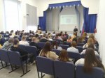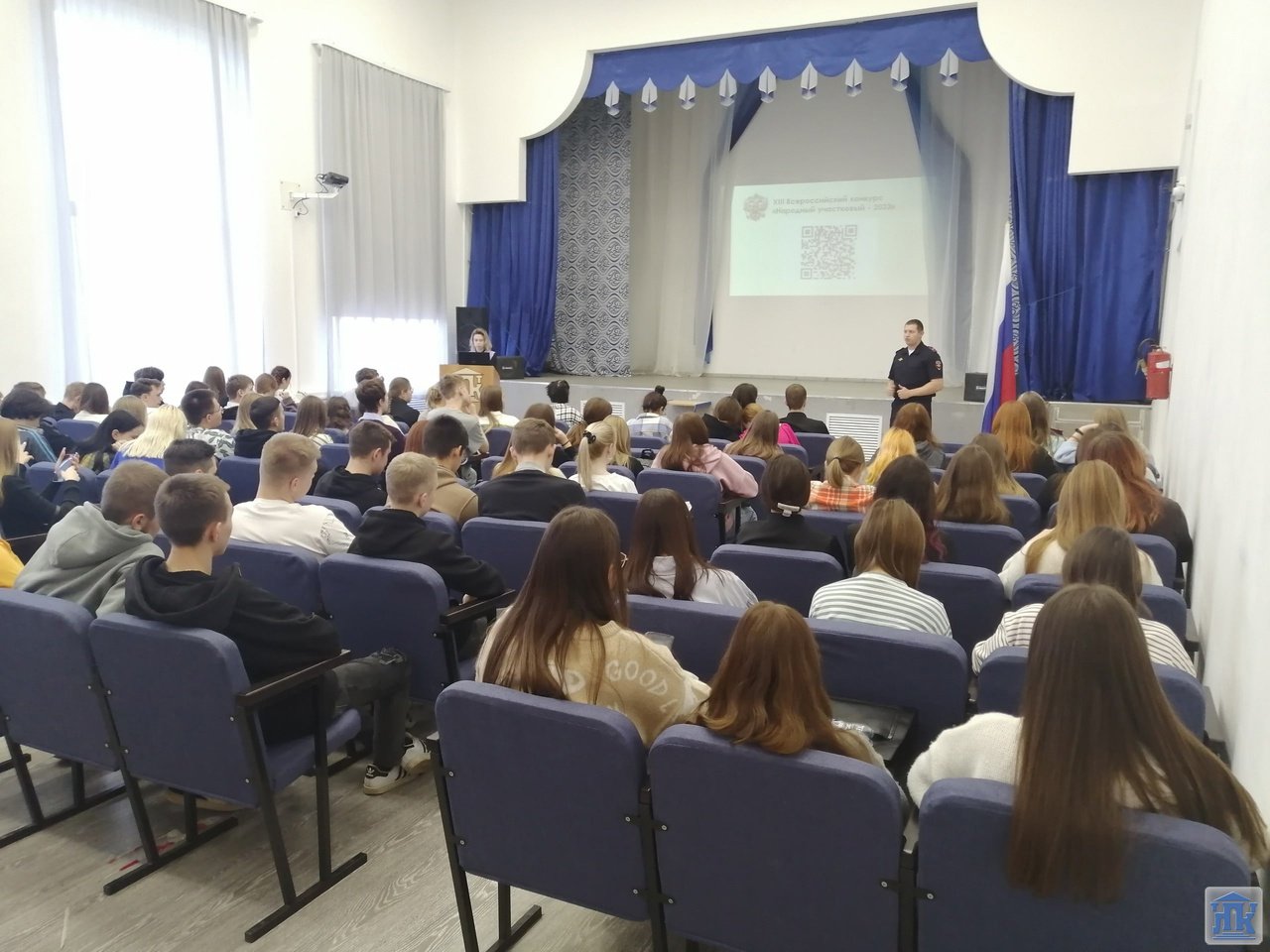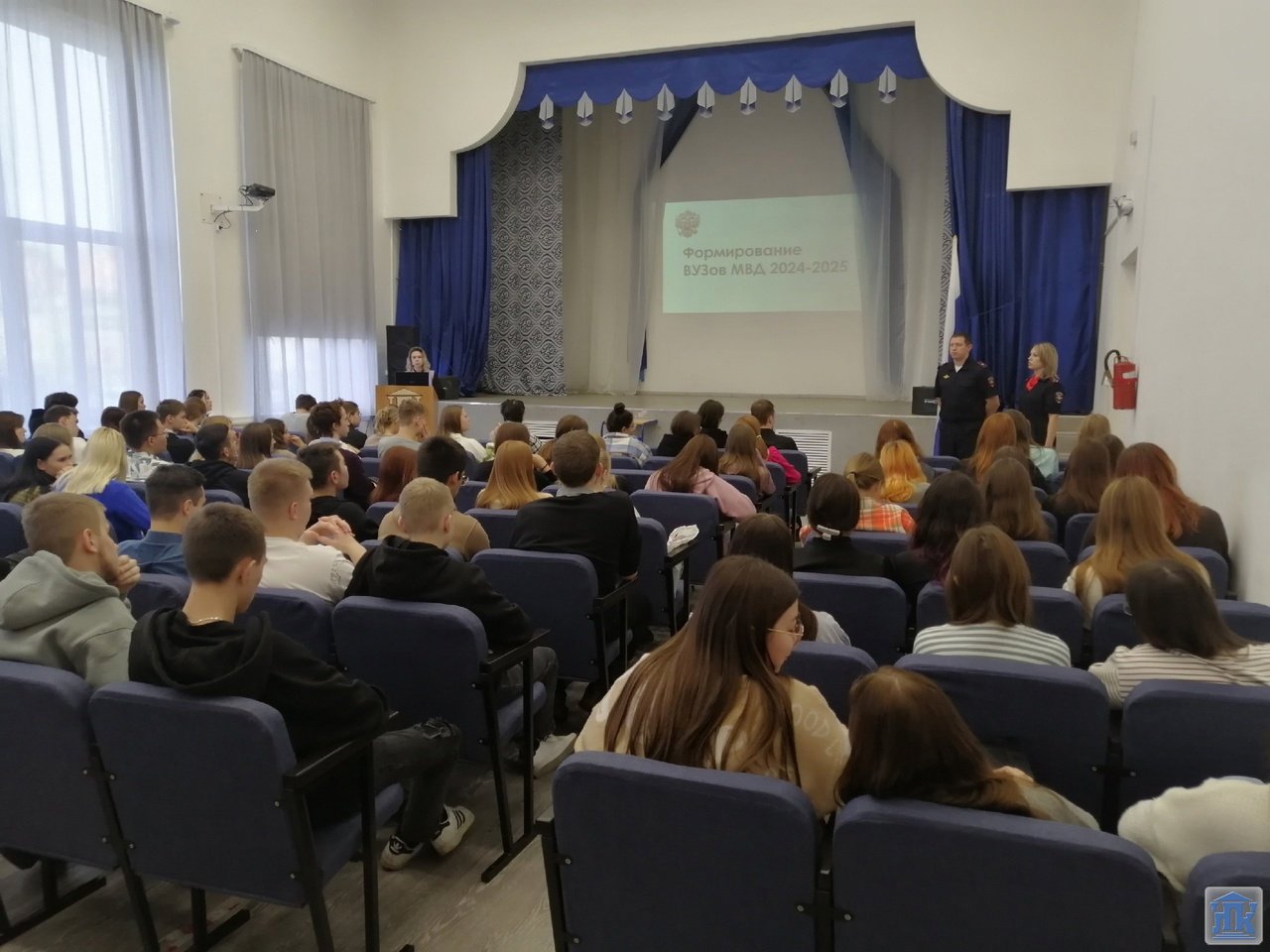 Специалист по кадрам отдела по работе с личным составом Мальцева Софья Михайловна провела профориентационную часть мероприятия, объяснив правила и требования по поступлению в ВУЗы МВД России. Хочется отметить, что Софья Михайловна выбрала службу в полиции не случайно – она выпускница нашего колледжа по специальности 40.02.01 «Право и организация социального обеспечения», была председателем студенческого Совета и участником правоохранительного студенческого отряда «СОБР».