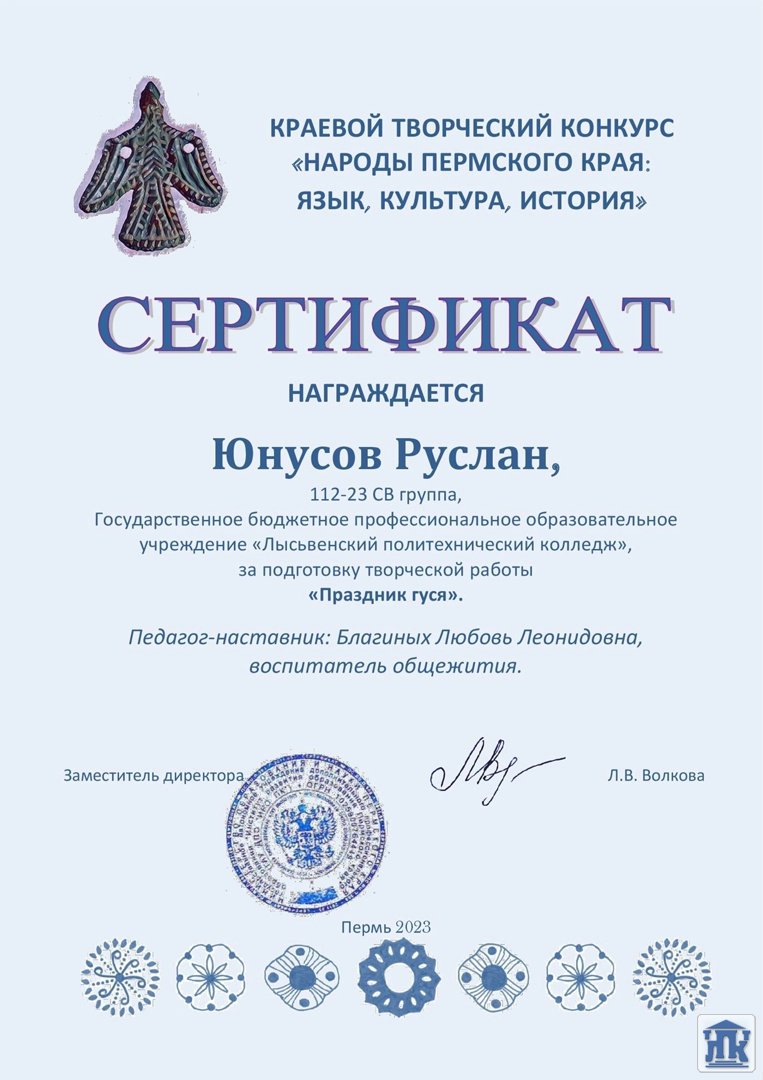 Поздравляем студента группы 112-23-СВ Юнусова Руслана, проживающего в общежитии колледжа (по адресу: пр-кт Победы, 118), с участием в краевом творческом конкурсе «Народы Пермского края: язык, культура, история» в номинации: «Народные обычаи и поверья», творческая работа: «Праздник гуся».
