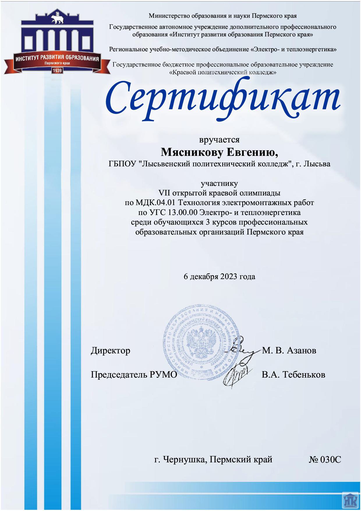 6 декабря прошла VII открытая краевая олимпиада по дисциплине «Технология электромонтажных работ» по УГС 13.00.00 «Электро- и теплоэнергетика», в которой приняли участие 87 студентов профессиональных образовательных учреждений Пермского края.