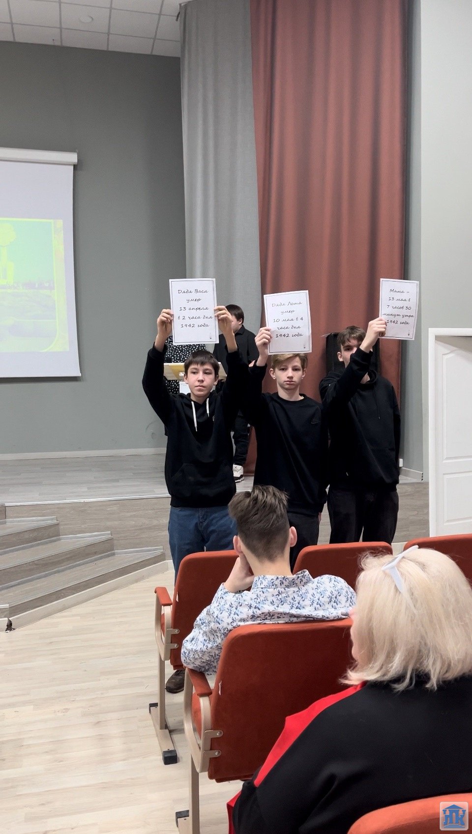 Это был своеобразный рассказ о голоде и лишениях ленинградцев, о стойкости жителей и глубокой веры в победу, о том, что, Ленинград продолжал жить, не смотря на сгоревшие продовольственные склады, на нормы выдаваемого хлеба, на крепкие морозы, постоянные бомбёжки… Ведущие рассказали студентам о дневнике Тани Савичевой, о тех счастливых, кто выжил в этом аду.