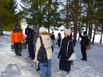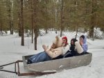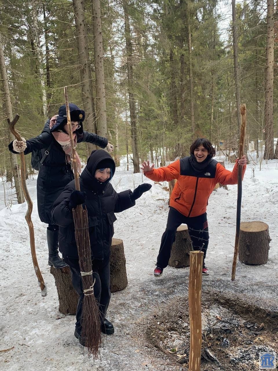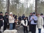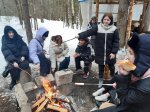 Почувствовать весь вкус зимнего похода-экскурсии нам удалось, остановившись для отдыха на стоянке «Медвежья берлога», где уже заботливые мужчины (авторы тех самых стоянок) развели костер, вскипятили воду для чая и для каши. Нет ничего вкуснее в зимнем лесу горячего чая из трав, гречневой каши с тушенкой и, конечно, поджаренной сосиски на костре! А какие угощения приготовили сами студенты – пальчики оближешь!