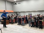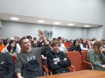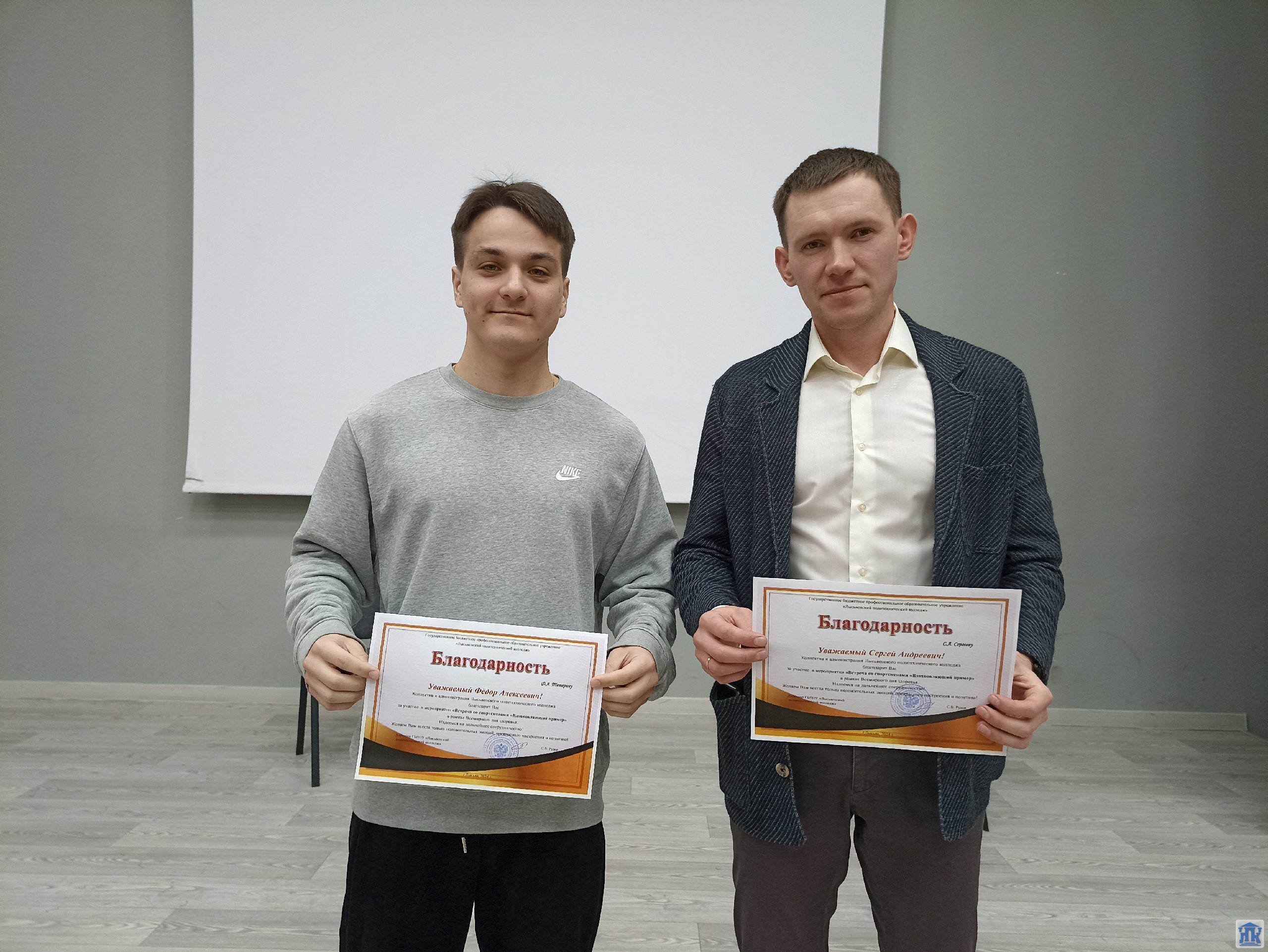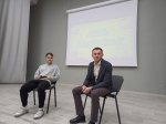 На встречу со студентами пришли Сергеев Сергей Андреевич, тренер-преподаватель спортивной школы олимпийского резерва, и его воспитанник, Тетерин Фёдор, член сборной России по лыжному двоеборью.