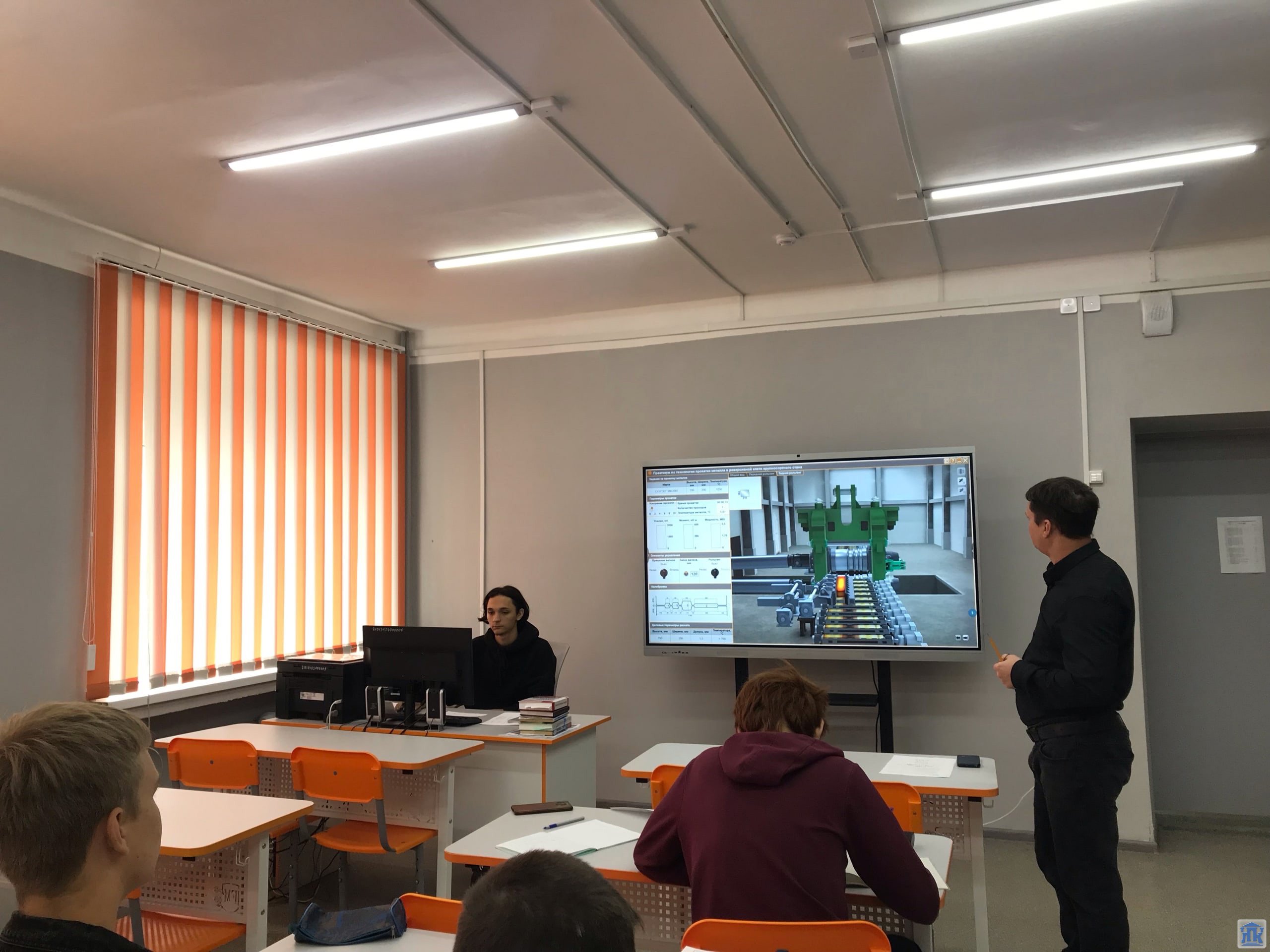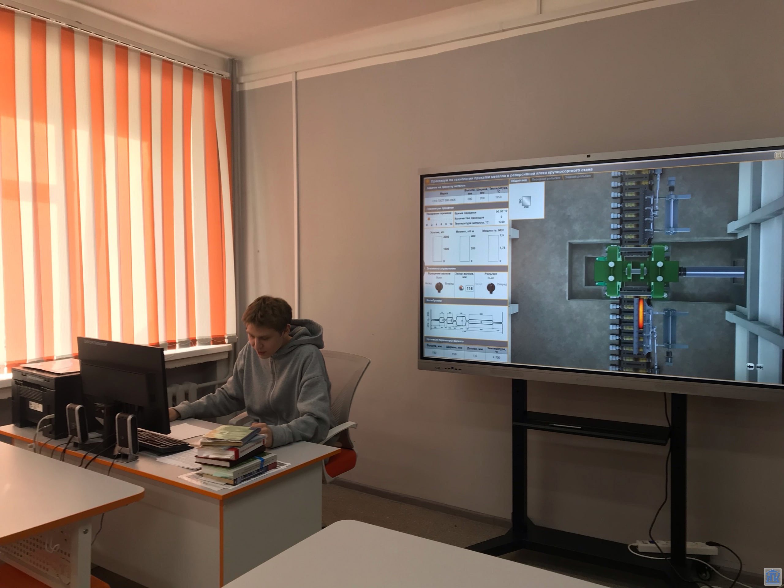 Ребята ознакомились с учебным модулем виртуальной прокатки в реверсивной клети крупносортного стана, произвели сложные расчеты при прокатке на калиброванных валках под руководством преподавателя Корягина Евгения Витальевича.