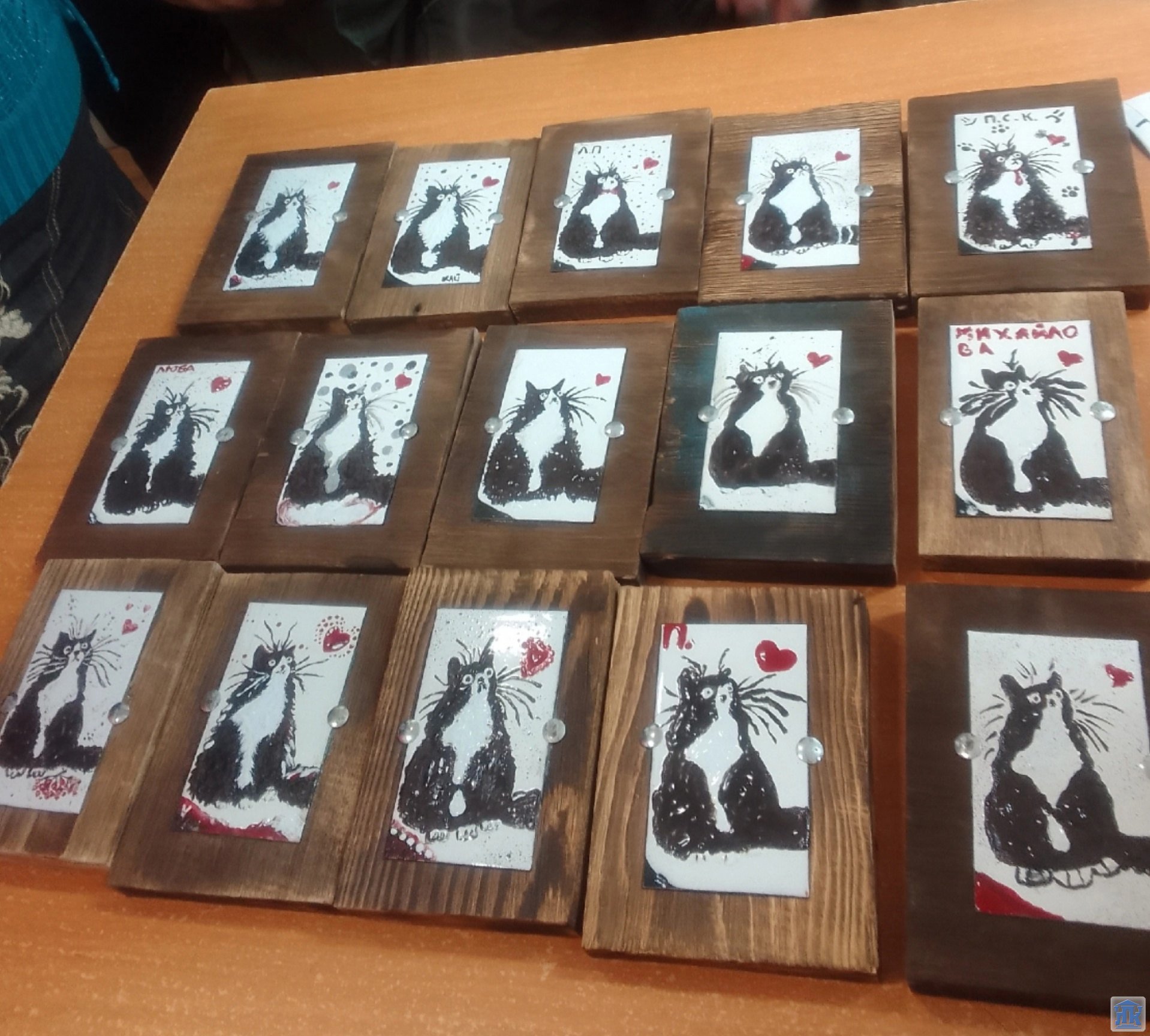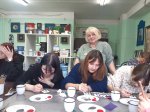 Но, самое главное, студентам хотелось попробовать себя в роли художника росписи по эмали (горячей). Радушно встретила нас руководитель художественной мастерской по росписи Людмила Ивановна Нефедкина, нам посчастливилось под её чутким руководством окунуться в творчество. Мы все рисовали один сюжет, но у всех получился свой котик, особенный, со своим характером. Я бы назвала это групповым автопортретом.