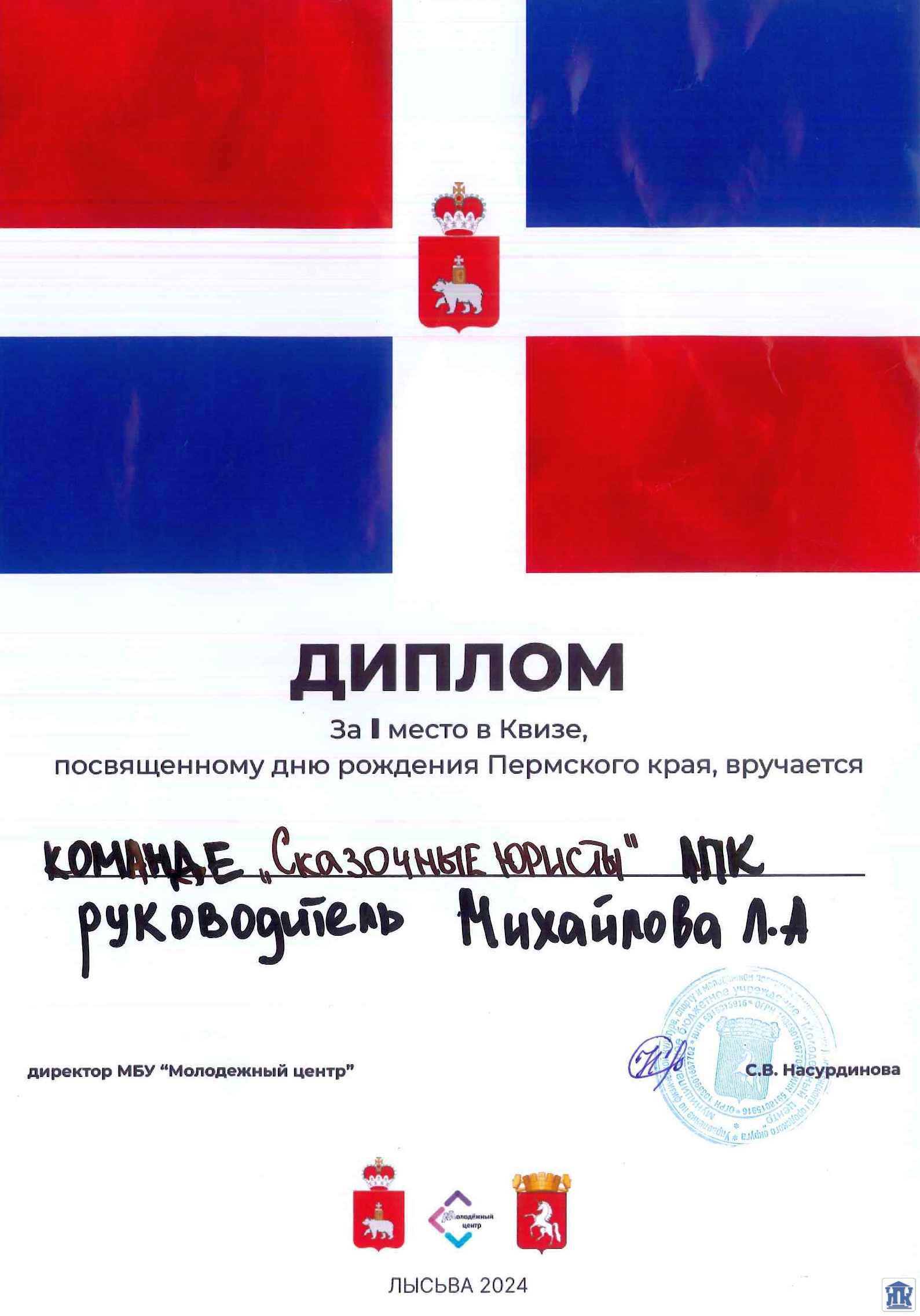 Команда колледжа «Сказочные юристы» (студенты группы 15-24-ПД специальности 40.02.02 "Правоохранительная деятельность" Артем Фасхутдинов, Алена Миронова, Татьяна Сайдакова, Анастасия Пушкарева, Ксения Мухамедова, Полина Золотова) показала отличные знания истории родного края и стала первой!