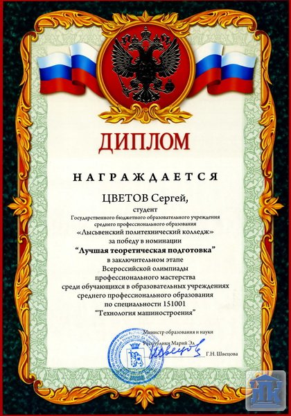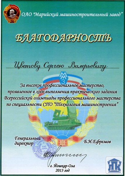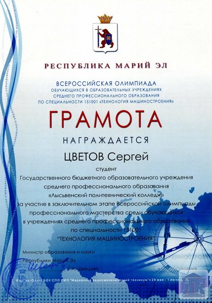 По результатам Олимпиады Цветов Сергей занял итоговое 7 место, выиграл номинацию «Лучшая теоретическая подготовка», награжден призами от компании АСКОН. Министр образования и науки республики Марий Эл Г.Н.Швецова вручила грамоту за участие во Всероссийской олимпиаде, а генеральный директор Марийского машиностроительного завода Б.И.Ефремов объявил благодарность за высокое профессиональное мастерство, проявленное в ходе выполнения практического задания.