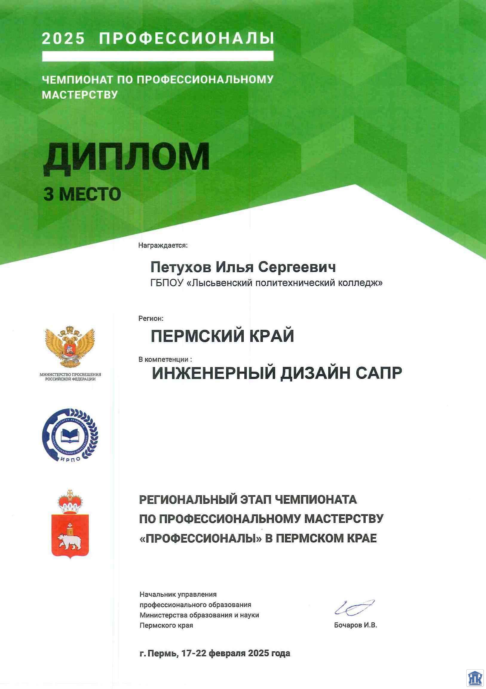 Наш колледж в компетенции «Инженерный дизайн САПР» представлял студент группы 46-22-ТМ специальности 15.02.08 «Технология машиностроения» Петухов Илья.