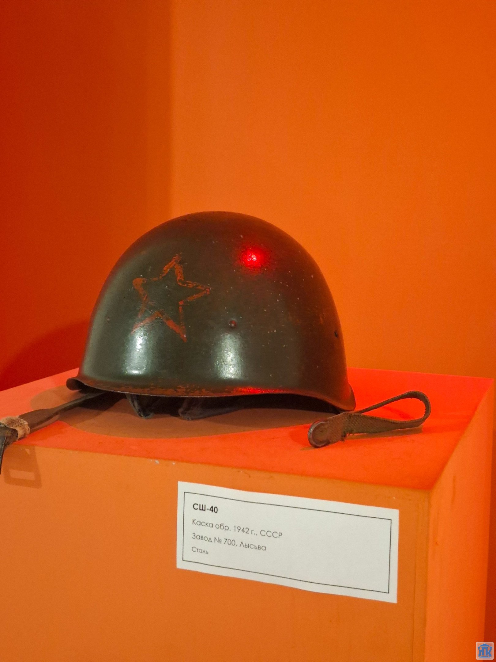 Единственное предприятие в СССР, которое выпускало солдатские каски после захвата Сталинграда во время Великой Отечественной войны, называлось Лысьвенский металлургический завод. Защитные головные уборы не являлись его основным профилем, поэтому весь производственный процесс был освоен и запущен с нуля. Стальной шлем, СШ-40, был основным защитником солдат в условиях военных действий. На Лысьвенском заводе за период производственной необходимости было отштамповано более десяти миллионов защитных шлемов. Один из залов музея воспроизводит заводской цех, который дает полное представление о технологии производства касок – от плавки стали до испытаний отстрелом в тире.