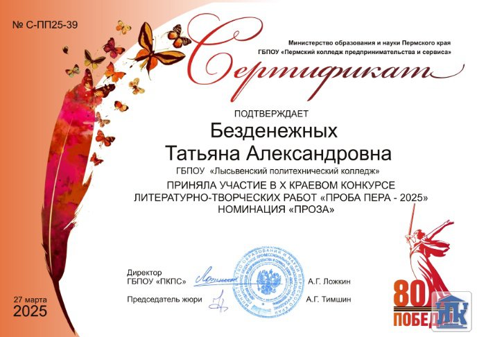В рамках краевого конкурса литературно-творческих работ «Проба пера – 2025» в номинации для педагогов приняла участие преподаватель ГБПОУ «Лысьвенский политехнический колледж» Безденежных Татьяна Александровна. Она представила на суд компетентного жюри свою творческую работу, которая была оценена известными писателями и журналистами нашего края.
