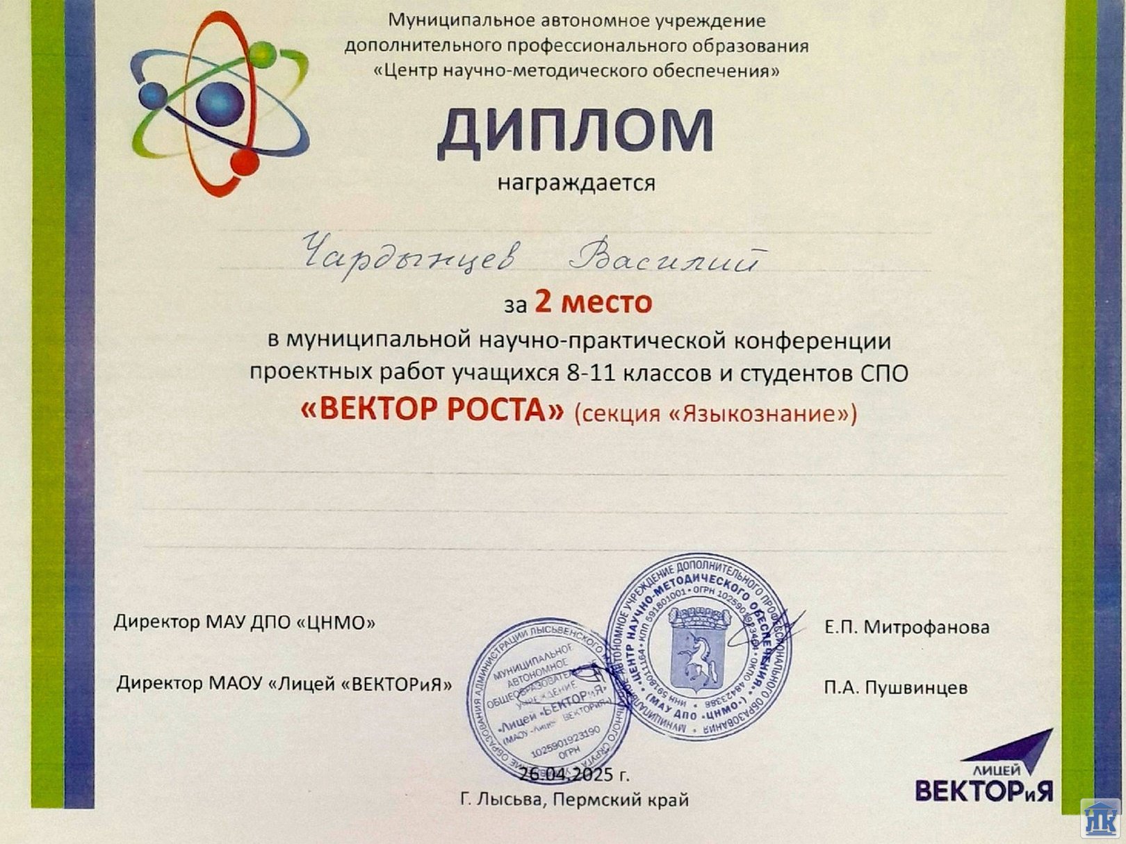 От колледжа приняли участие два студента первого курса, которые стали призёрами: Бабина Анжелина, группа 24-МИШИ (классный руководитель – Стяжкова Л.В.), заняла первое место в гуманитарной секции, Чардынцев Василий, группа 24-СВ-2 (классный руководитель – Безденежных Т.А.), в секции «Языкознание» – второе место.