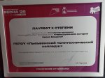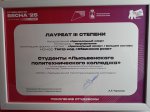 Вот такие замечательные итоги, которыми хочется поделиться: – лауреат 2 степени в направлении «Арт» – Ларионова Полина, студентка группы 204 (руководитель – Грабаровская Ирина Николаевна); – лауреат 3 степени в направлении «Оригинальный жанр» – студенты группы 204 с номером «Обвинская роза» (руководители – Грабаровская Ирина Николаевна, Аликина Юлия Сергеевна); – дипломанты в направлении «Танцевальное» – студенты Лебеденков Владислав (группа 24-ОМС-1) и Рыбина Елизавета (руководитель – Аликина Юлия Сергеевна); – специальный приз за эксперимент в направлении «Студенческий театр» – студенты колледжа Тихомиров Валериан (группа 209) и Валиева Мария (группа 303).
