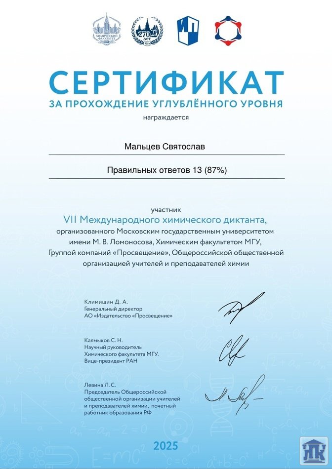 Многие первокурсники порадовали хорошими результатами «Химдиктанта-2025», но особенно хочется выделить студентку группы 15-24-ПД Чиркову Арину, получившую 100% на базовом уровне!