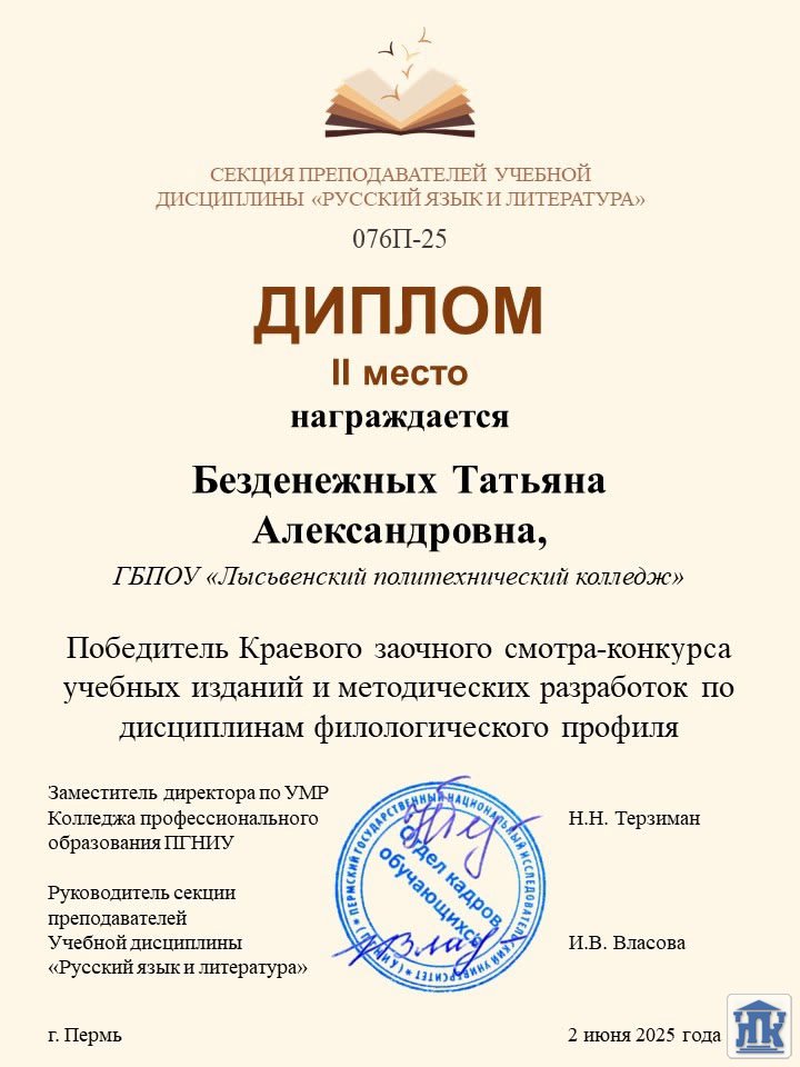 От нашего учебного заведения в конкурсе принимала участие преподаватель русского языка и литературы Безденежных Татьяна Александровна Поздравляем её с победой — дипломом 2 степени!