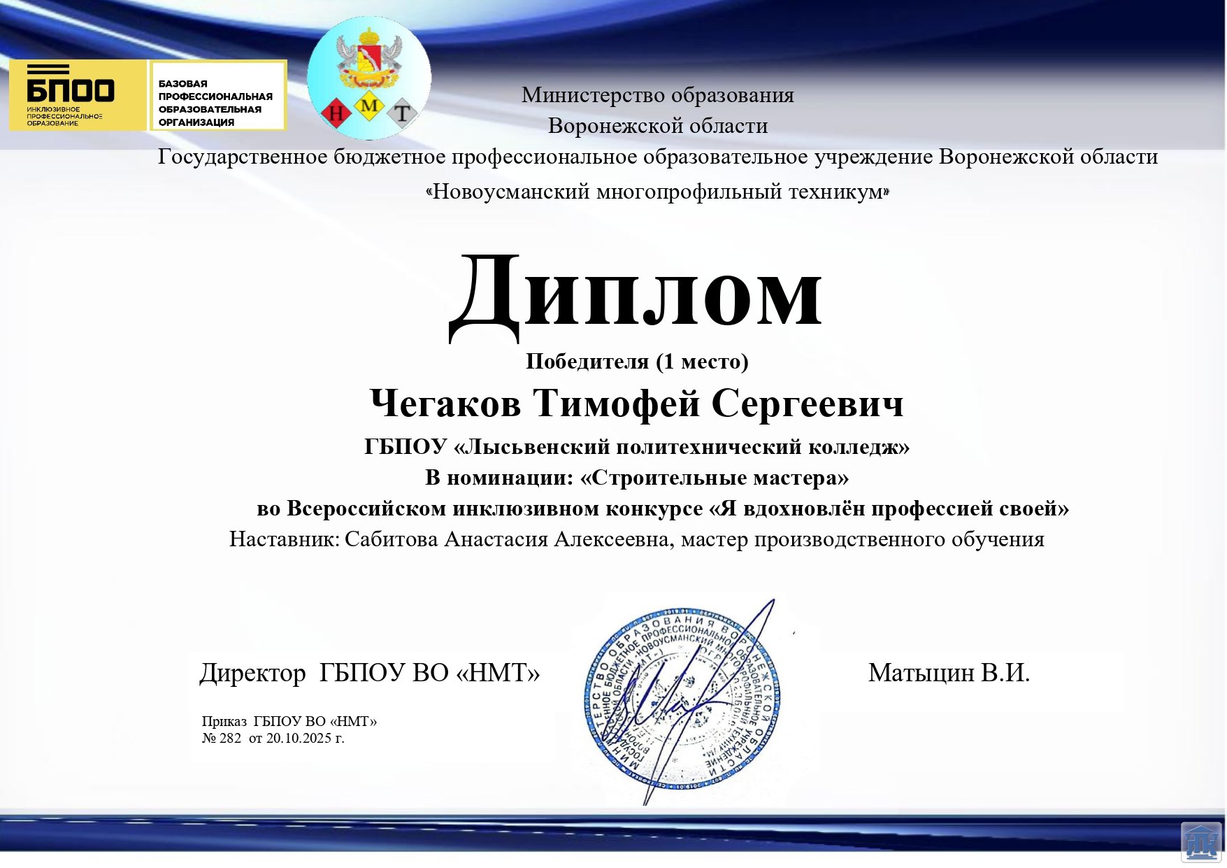 Рады поздравить студентов ГБПОУ «Лысьвенский политехический колледж», занявших призовые места: 1 место – Чегаков Тимофей (группа 08-25-ШМО); 3 место – Гредина Анжела (группа 01-25-ШО).