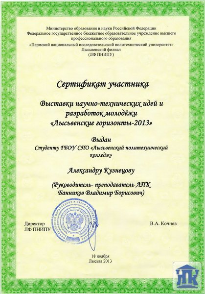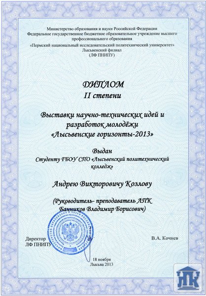 В Лысьвенском филиале ПНИПУ с 18 октября по 18 ноября проходила выставка научно-технических идей и разработок молодежи «Лысьвенские горизонты». В выставке приняли участие и наши студенты Андрей Козлов и Александр Кузнецов, которые представили свои новые работы: «Сетевой сканер на микроконтроллерах» (А.Козлов) и «Модель станка с числовым программным управлением» (А.Кузнецов).