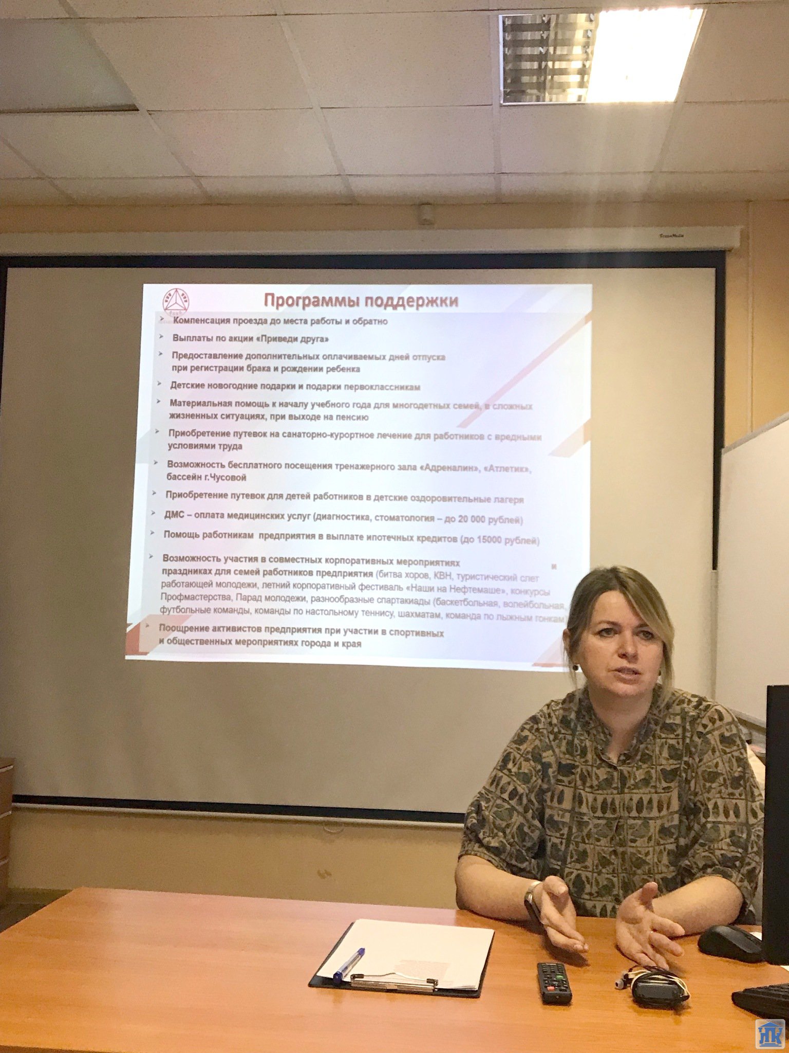 Бульканова Наталья Сергеевна рассказала об истории предприятия, социальной политике, рабочих местах, а затем познакомила ребят с производством и технологическим процессом изготовления двигателей.