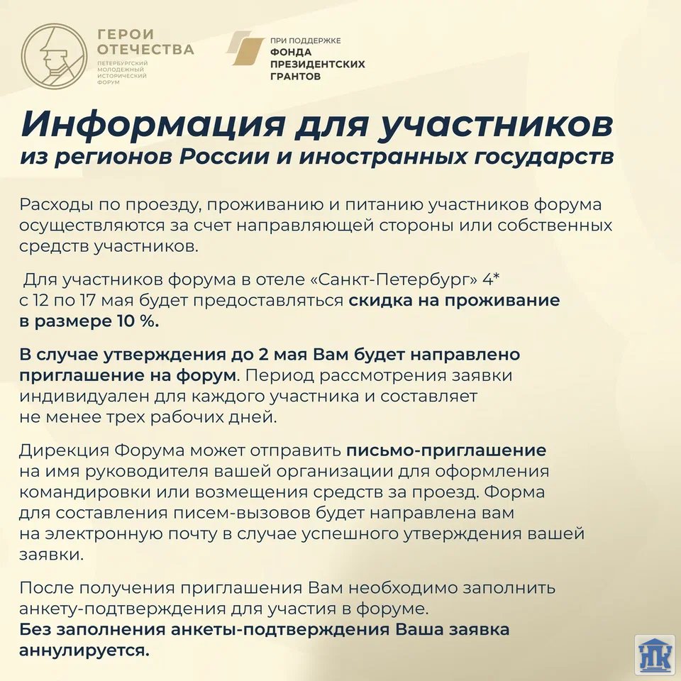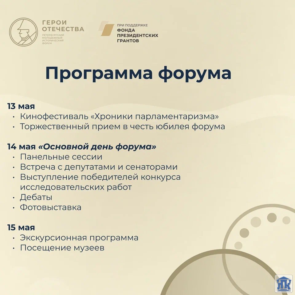 В период с 13 по 15 мая года в городе Санкт-Петербурге пройдет V Петербургский молодежный исторический форум «Герои Отечества» по инициативе команды школьников и студентов при поддержке Министерства просвещения Российской Федерации, Федерального агентства по делам молодёжи, Российского исторического общества, «Движение Первых», депутатов Государственной Думы и сенаторов Российской Федерации.