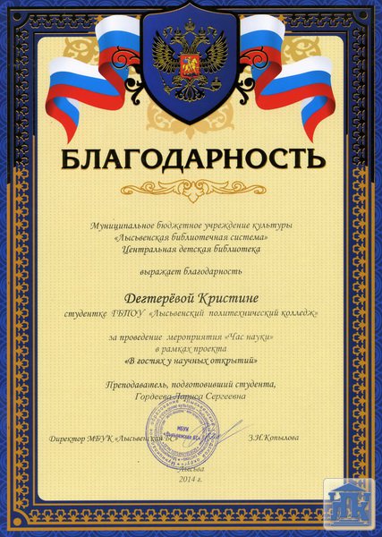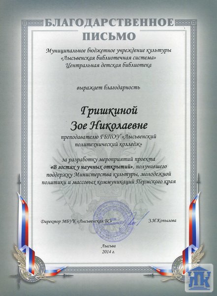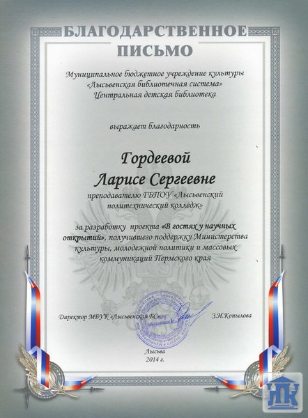 Весь апрель преподаватели и студенты нашего колледжа проводили различные мероприятия в городской библиотеке в рамках проекта «В гостях у научных открытий» (руководитель проекта – Л.В.Старкова, зав. центральной детской библиотекой). Проект стал победителем конкурса и получил поддержку Министерства культуры, молодежной политики и массовых коммуникаций Пермского края.
