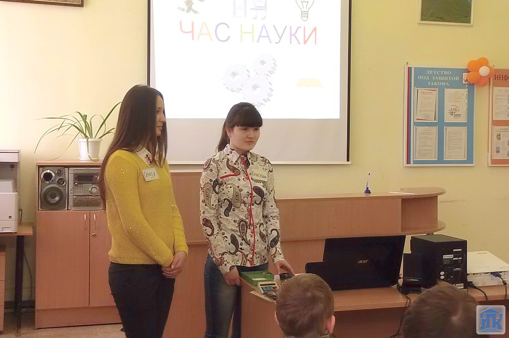 Кристина Дегтерёва и Олеся Казынбаева (37-УК) провели мероприятие «Час науки», рассказали ребятам о нанотехнологиях, об учёных и о том, как открывают тайны природы. Кстати, Олеся и Кристина придумали название творческой выставки проекта.