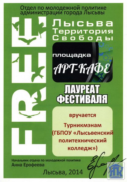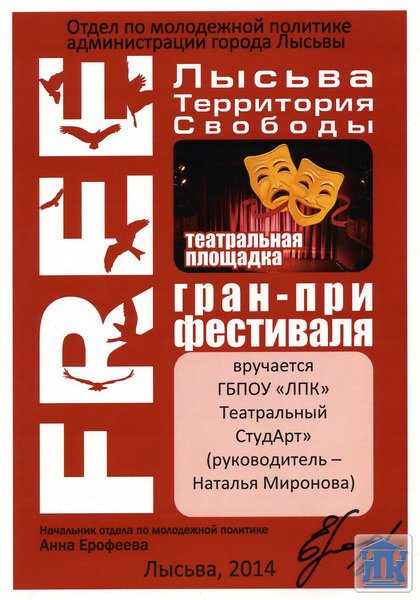 Студенты нашего колледжа успешно выступили и получили заслуженные призы. Театральная студия «Арт» под руководством Мироновой Натальи Александровны впервые взяла Гран-при в номинации «Театр» в направлении «Театральная постановка» (малая форма), Фоменко Игнат (гр. 28-КС) получил диплом 2 степени в направлении «Художественное слово», Мелехов Данил (гр. 28-КС) уже не первый раз принимает участие в этом фестивале и в этом году получил диплом 3 степени за фотоработы. И, конечно же, всем полюбившиеся ребята, которые ведут здоровый образ жизни – турникмены – тоже показали свое творчество и стали лауреатами в направлении «Оригинальный жанр».