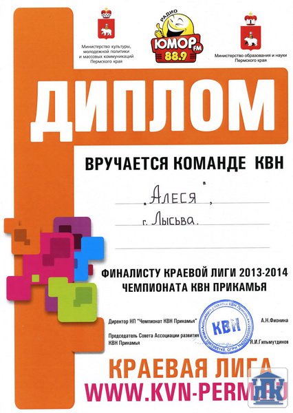 Финал Краевой лиги чемпионата КВН Прикамья 11 мая во дворце молодежи города Перми состоялся финал Краевой лиги 2013-2014 чемпионата КВН Прикамья