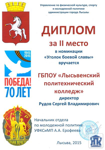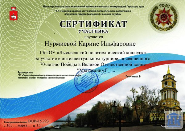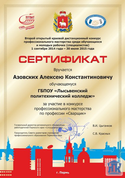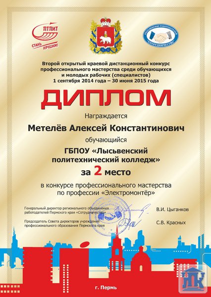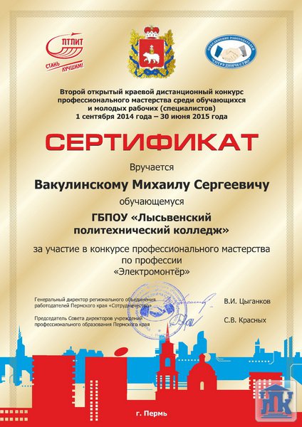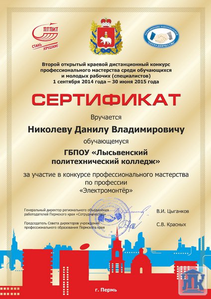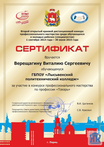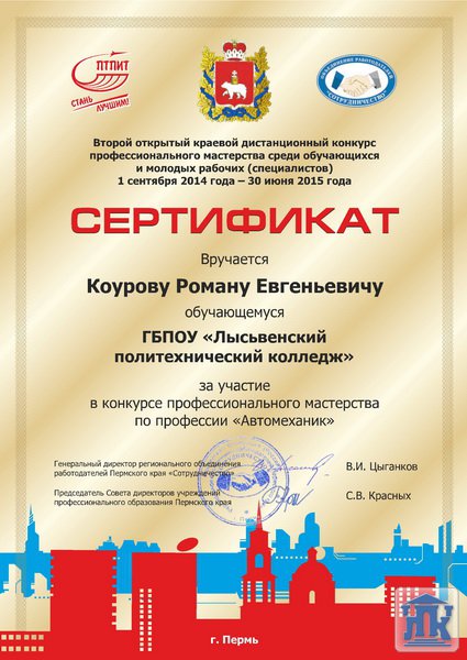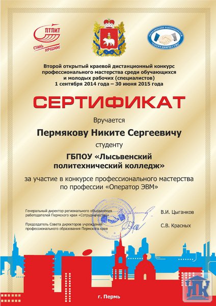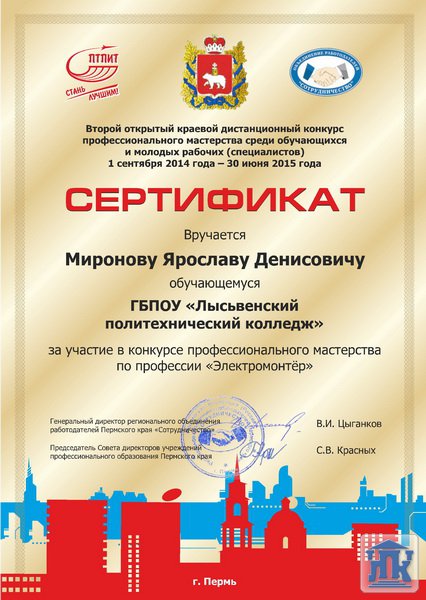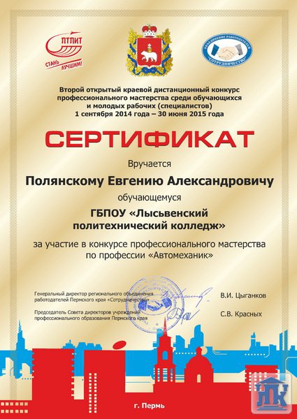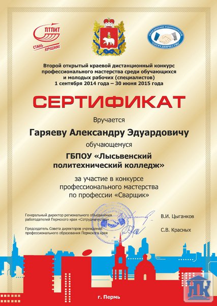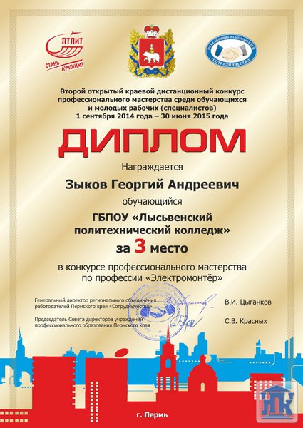 Пермский край, г. Лысьва, ул. Мира, д. 45, тел.: 8(34249) 3-79-70, доб. 205, 8(34249) 3-79-50, доб. 215, e-mail: gbpou-lpk@lpk.permkrai.ru