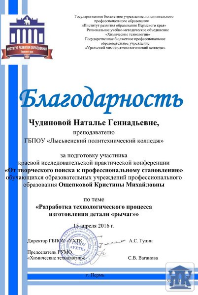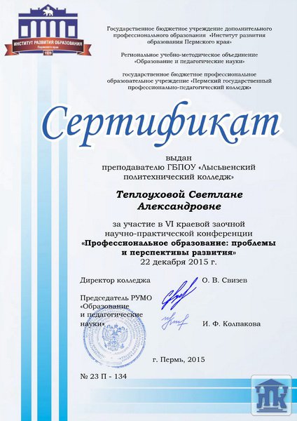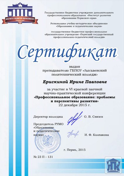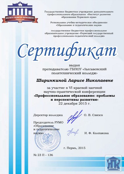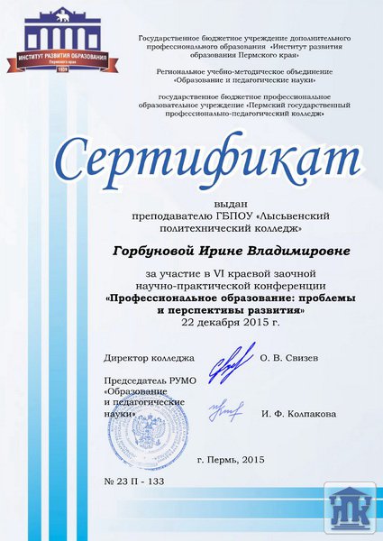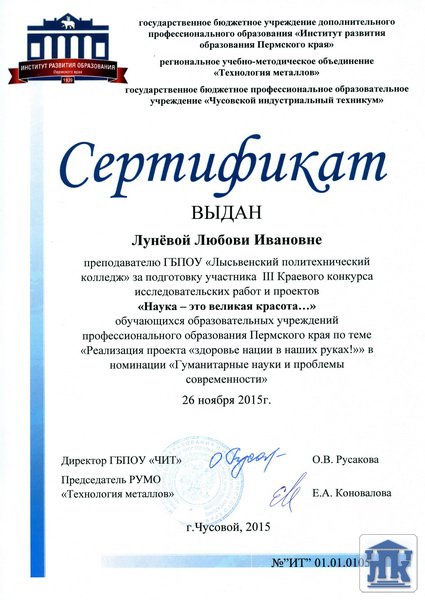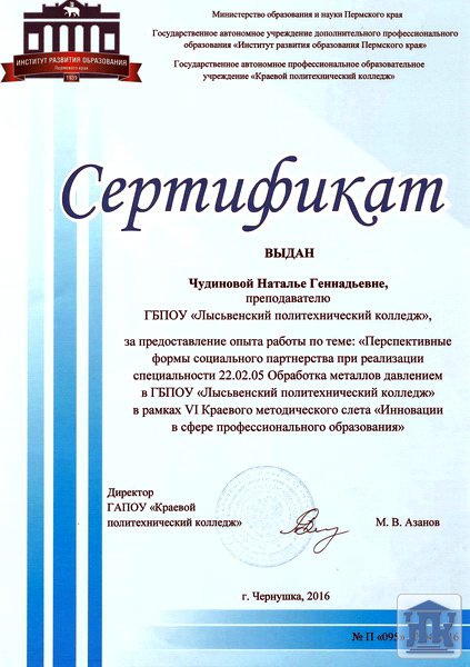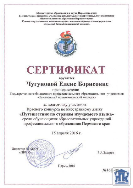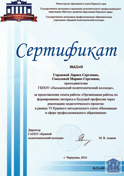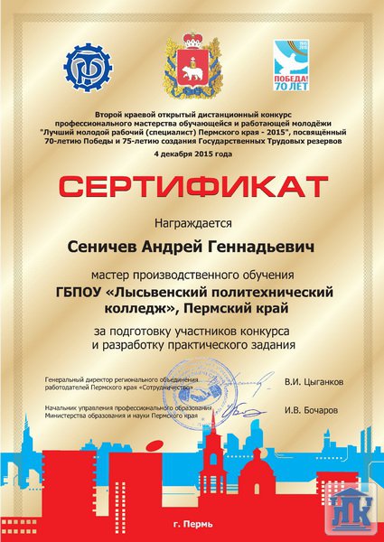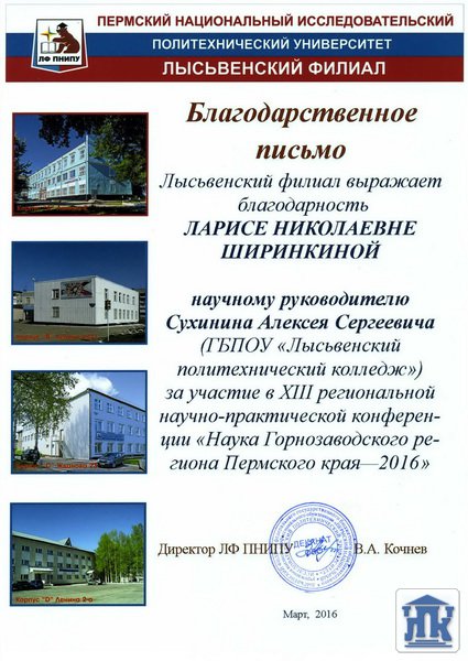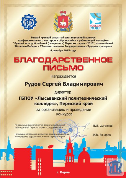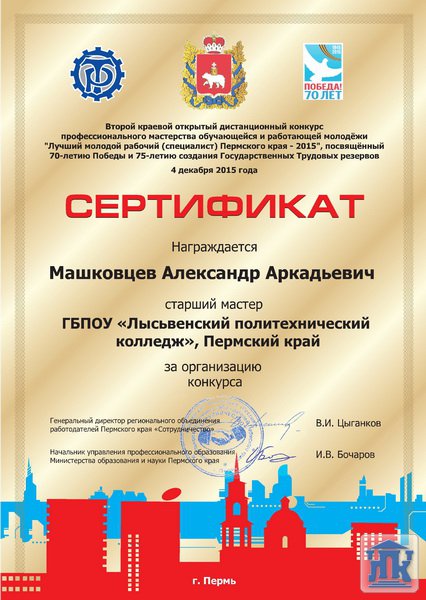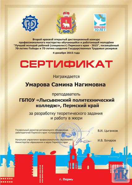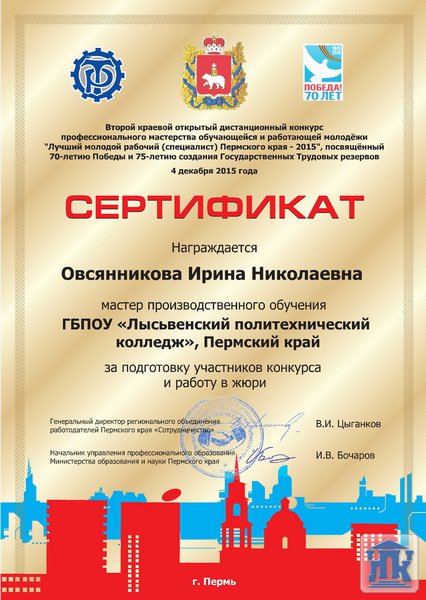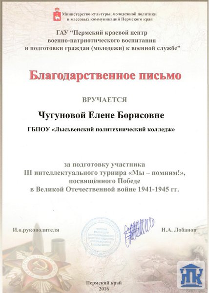 Пермский край, г. Лысьва, ул. Мира, д. 45, тел.: 8(34249) 3-79-70, доб. 205, 8(34249) 3-79-50, доб. 215, e-mail: gbpou-lpk@lpk.permkrai.ru